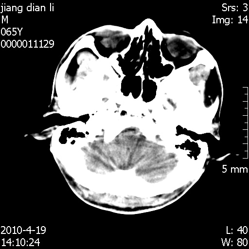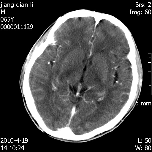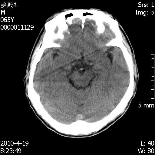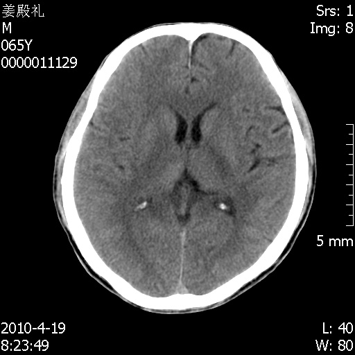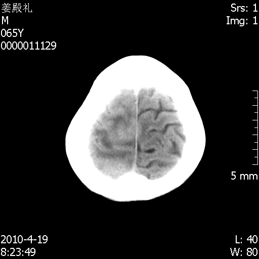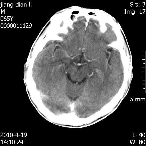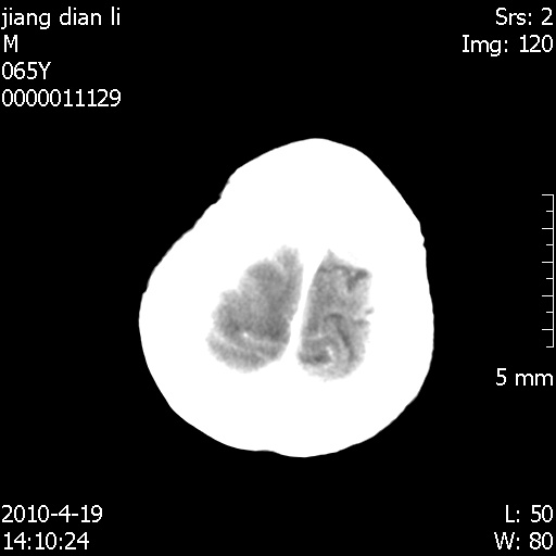 老年男性,突发左下肢无力1天,其余有价值的检查都没有。平扫ct值大约60hu,增强后ct值没什么改变,请大家讨论一下这个病例是什么?说明诊断理由。