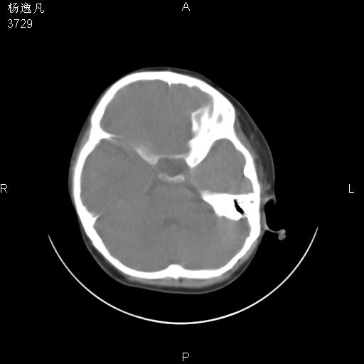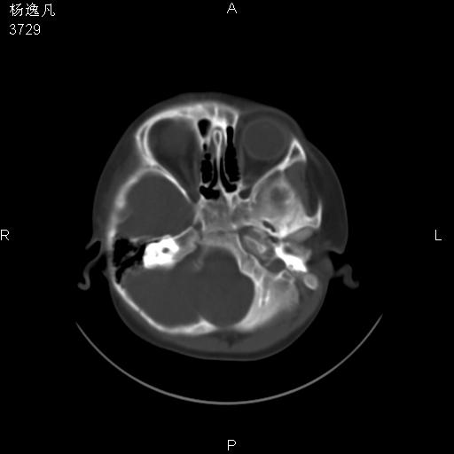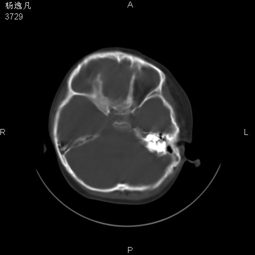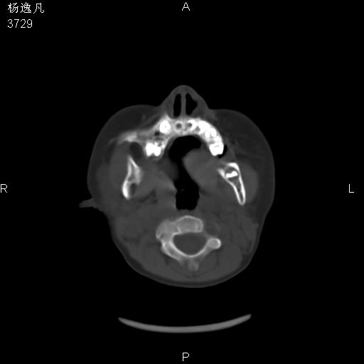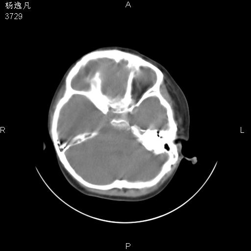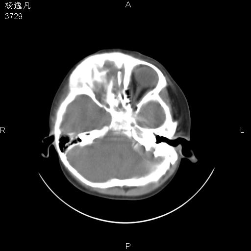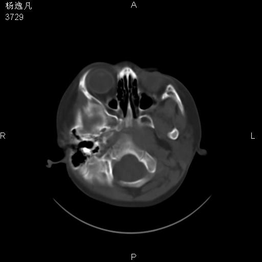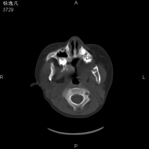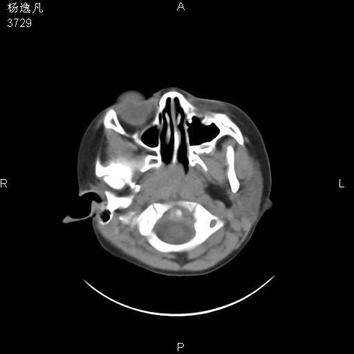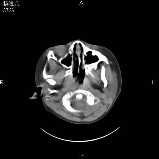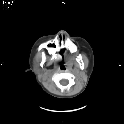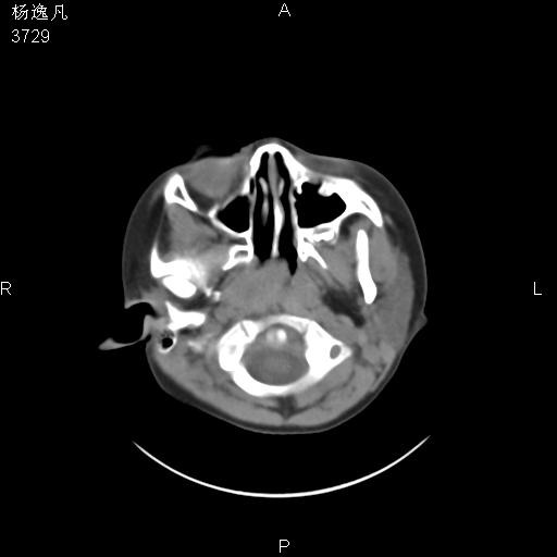 头颅ct平扫未见明确外伤性征象,右侧面部及颞部软组织肿胀,后鼻腔软组织影增大,增厚,鼻咽顶部变窄,考虑鼻咽腺样体增值肥厚。