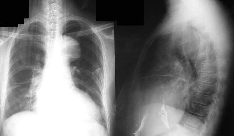 正位片左上纵隔旁可见突向肺野内半圆形密度增高影,边缘光滑,中心在纵隔内,与纵隔的夹角是钝角与主动脉结关系密切。侧位片可见升主动脉局限性迂曲扩张。考虑主动脉瘤[emb18][emb7][emb6]
