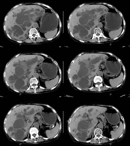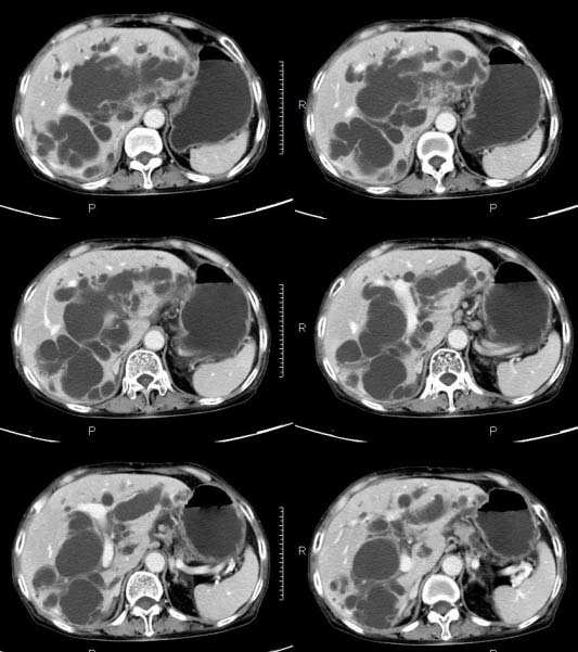 肝内胆管远侧、近侧不比例扩张,以近侧为明显。胆总管扩张。考虑先天性胆管囊肿(ⅳ型)。