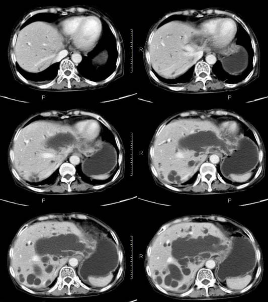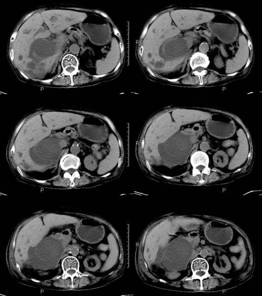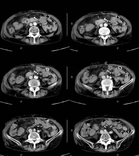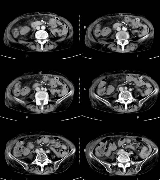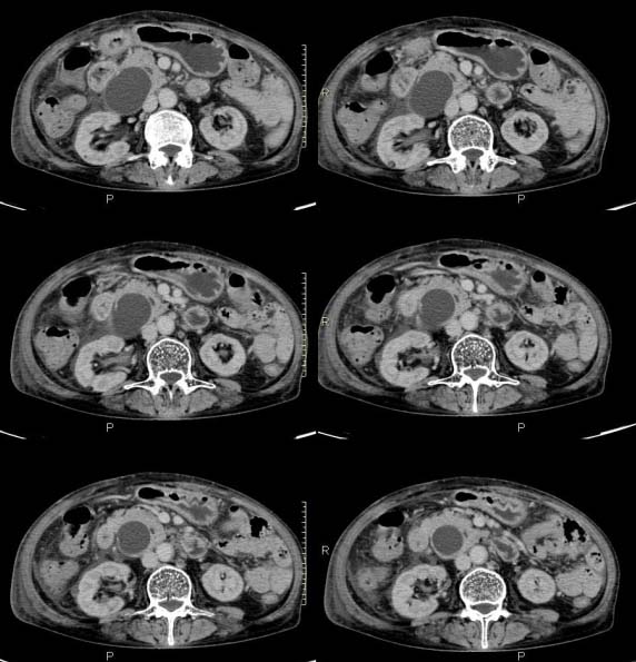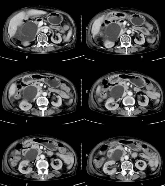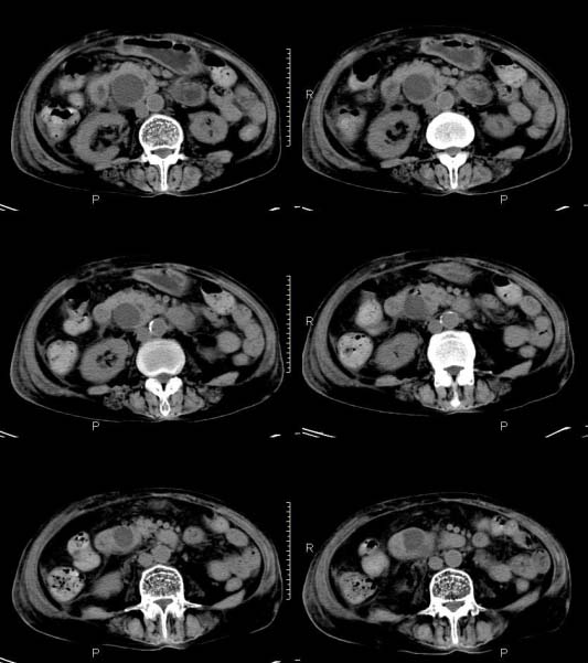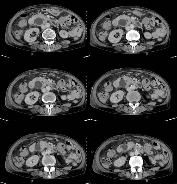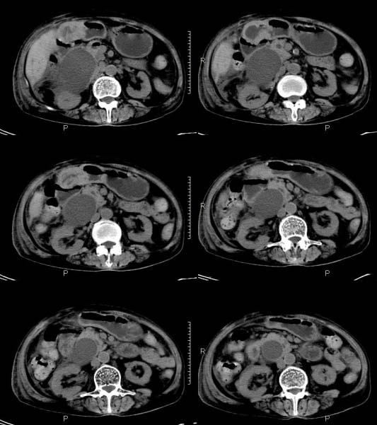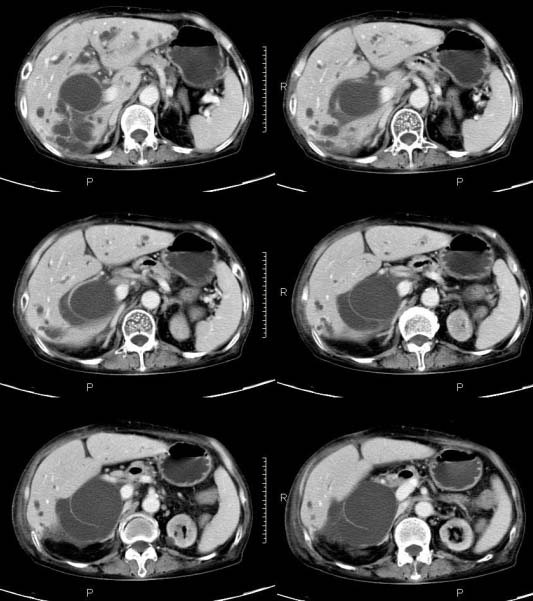 女,71岁,腹痛、腹胀、黄疸20余天,b超示肝内外胆管高度扩张内伴絮状物质(未提示梗阻部位或结石影),经抗炎解痉治疗后,肝功能有所好转,但胆道梗阻状态并未减轻。患者曾于1970年代做过胆囊切除术,1997年因胰腺炎而手术;且患者有糖尿病10余年。ct图片传了静脉期,未传动脉期了,最后一序列为3.2mm薄扫,请各位同仁仔细看看,确定一下胆管梗阻的部位,是炎性梗阻还是肿瘤性梗阻,是否与胰腺炎有关系,扩张胆总管中段前缘是否是胰管。请高手们最好用图示来指出梗阻部位。