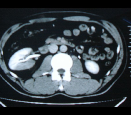 右肾上极巨大肿块,增强后肿块中度不均匀强化,内见大片无强化液化坏死区,肿块突破肾包膜侵犯肾后筋膜,与邻近腰大肌分界不清,右肾上腺未见明确显示,右肾静脉见充盈缺损,加上本患者有血尿,基本可以肯定为肾恶性肿瘤侵犯肾周伴肾静脉癌栓,此肿瘤为肾癌可能性大。