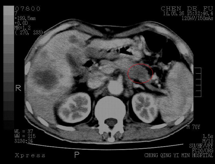 性别 男 70岁 因上腹部不适半月余,全身皮肤黄染来院检查。