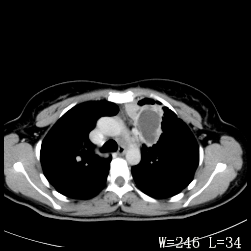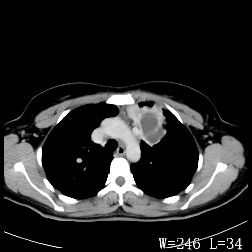 考虑左肺上叶胸腺瘤可能性大。肺不张/永存左上腔静脉