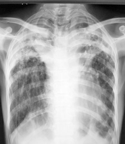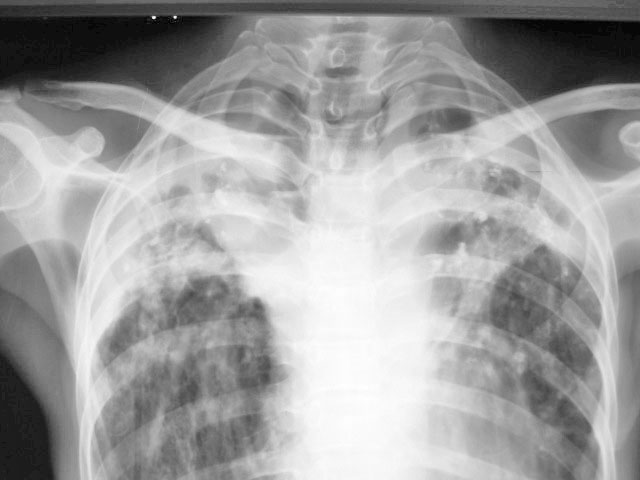 双肺上叶可见云絮状密度增高影,密度不均,边缘不清。其中可见类圆形低密度影。右下肺纹理呈垂柳状,膈肌呈幕状,左侧肋膈角消失。支持双肺继发性结核,空洞形成
