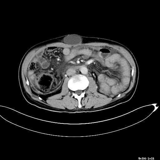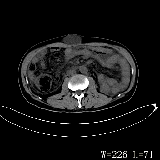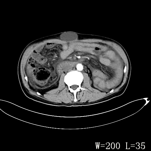 1)前腹壁中线区(脐上方)囊性占位性病变,考虑淋巴囊肿。2)腹水。