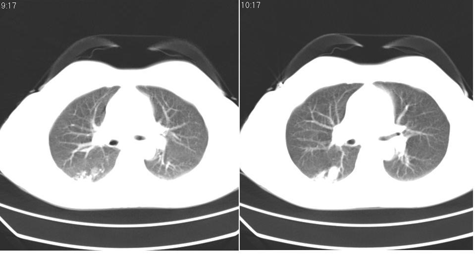 [br]下叶背段多发性小腺泡结节,考虑结核。