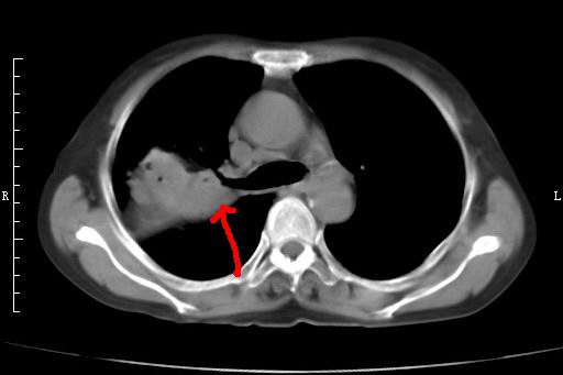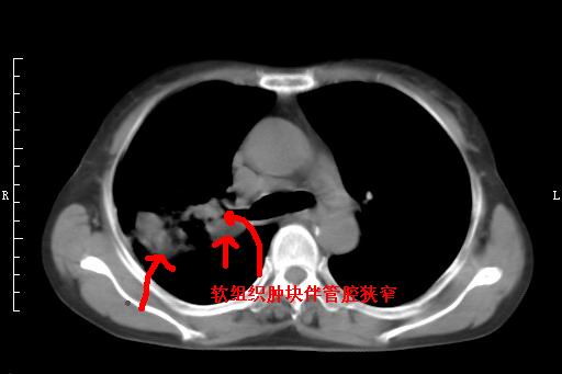 右上叶后段肺癌伴阻塞性炎症(肺脓肿形成)