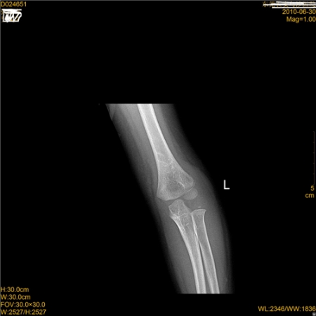 左侧肘关节外侧软组织肿胀明显,外侧髁“双边征”,考虑肱骨外侧髁低位髁上骨折,关节无脱位(桡骨小头连线正常)。