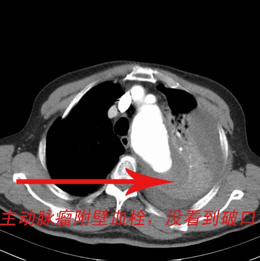 主动脉瘤伴附壁血栓。左侧胸腔积液,左肺段性肺不张。如果破裂,病人的症状应该很严重。