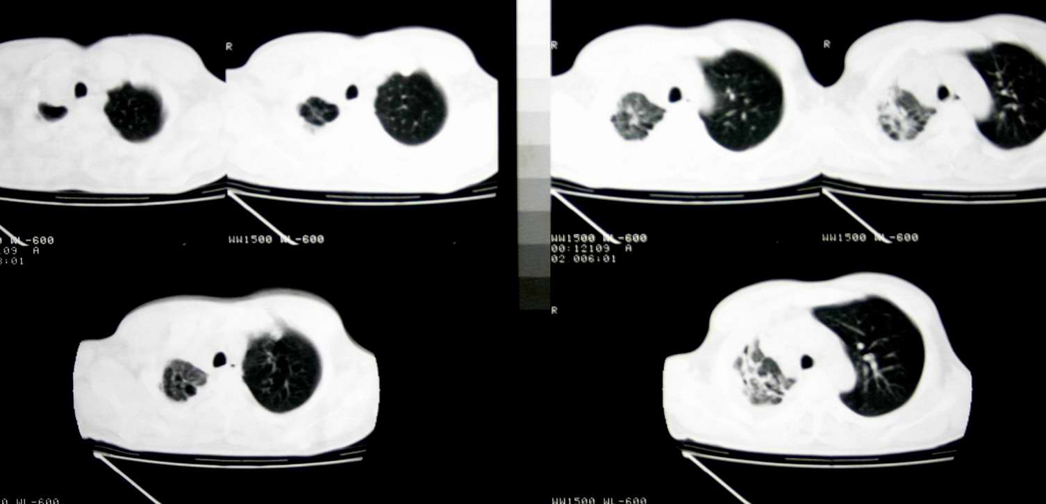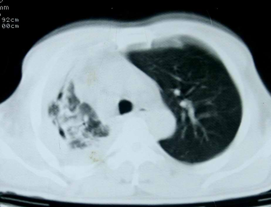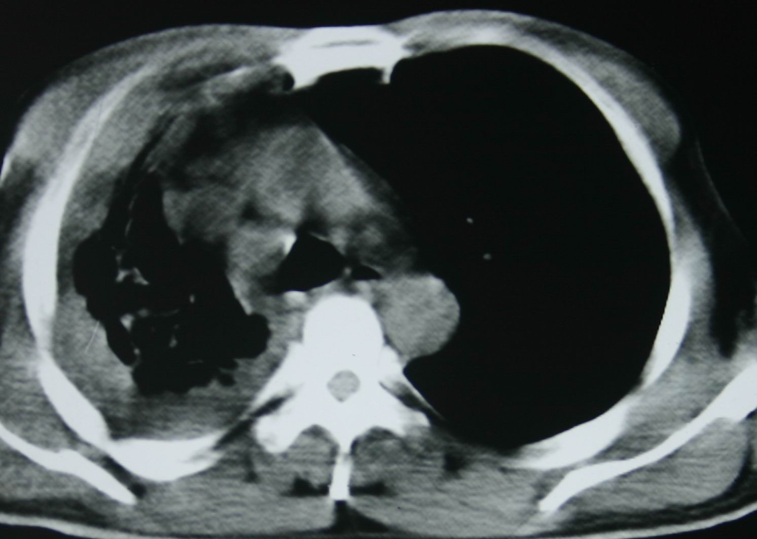 患者,男 ,48岁,反复咯血三个月,每三到五天咯一次,每次约200ml,鲜红色,无明显咳痰,咳嗽明显,无明显胸痛,无发烧,初期以抗感染、止血治疗,第一次ct报占位,支气管镜未见明显ca细,肺ca标志物、tb抗体均阴性,经过垂体后叶素、酚妥拉明、头胞他定、洛美沙星、立止血等治疗后,现病人一般情况好,停止咯血10天,咳嗽减少,咳黄脓痰,每日一次,每次30ml。现复查ct