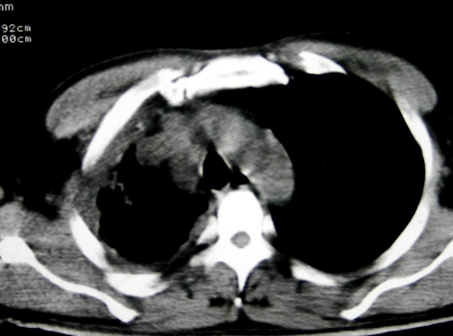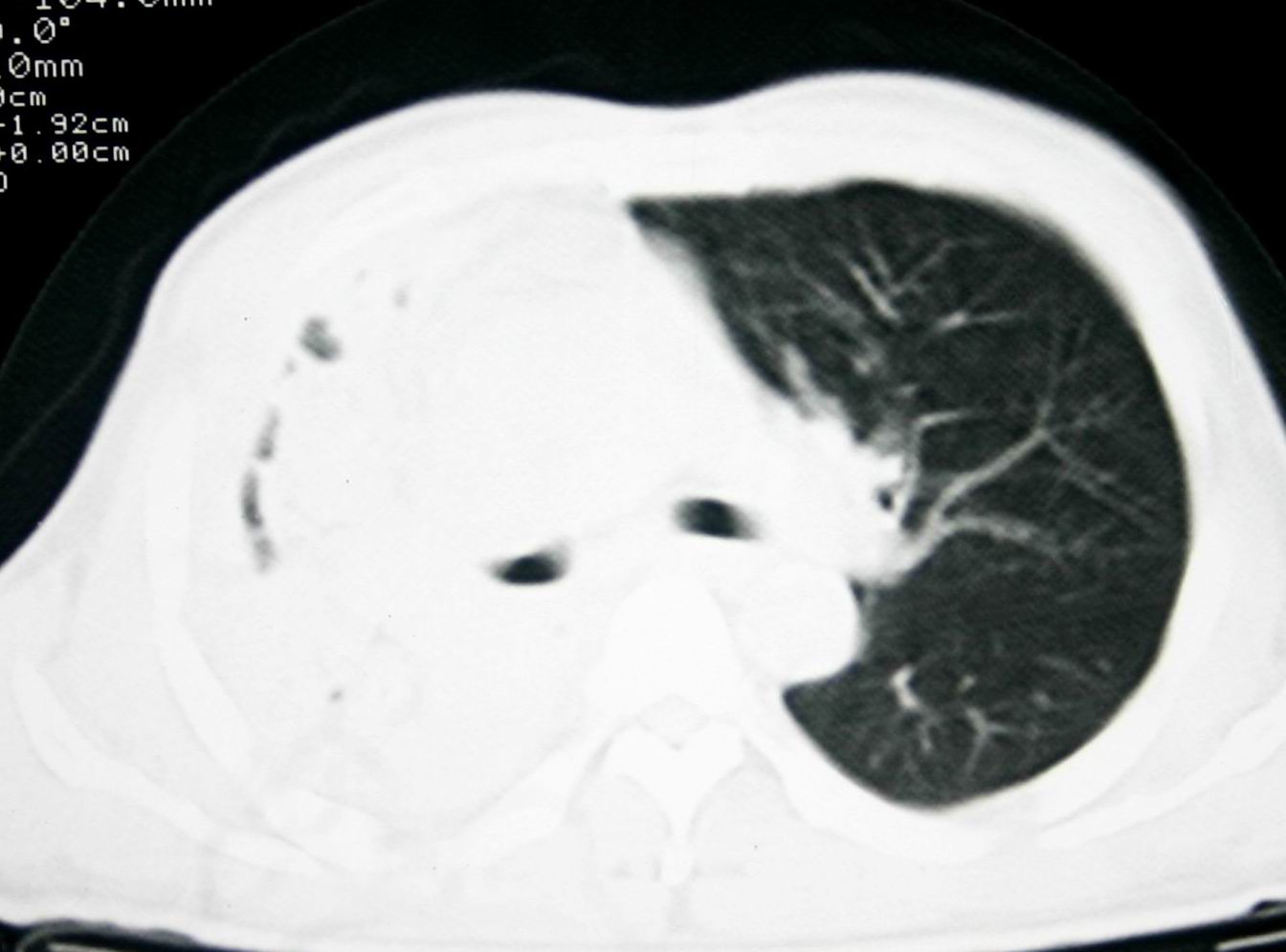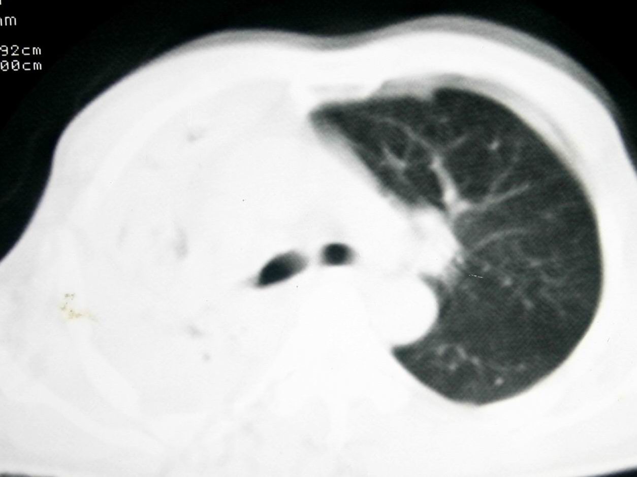 患者,男 ,48岁,反复咯血三个月,每三到五天咯一次,每次约200ml,鲜红色,无明显咳痰,咳嗽明显,无明显胸痛,无发烧,初期以抗感染、止血治疗,第一次ct报占位,支气管镜未见明显ca细,肺ca标志物、tb抗体均阴性,经过垂体后叶素、酚妥拉明、头胞他定、洛美沙星、立止血等治疗后,现病人一般情况好,停止咯血10天,咳嗽减少,咳黄脓痰,每日一次,每次30ml。现复查ct