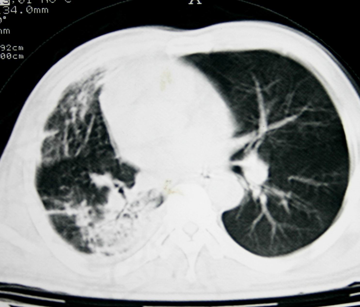 [br]1)考虑右肺继发性肺结核合并感染。2)右侧胸腔积液+胸膜增厚。