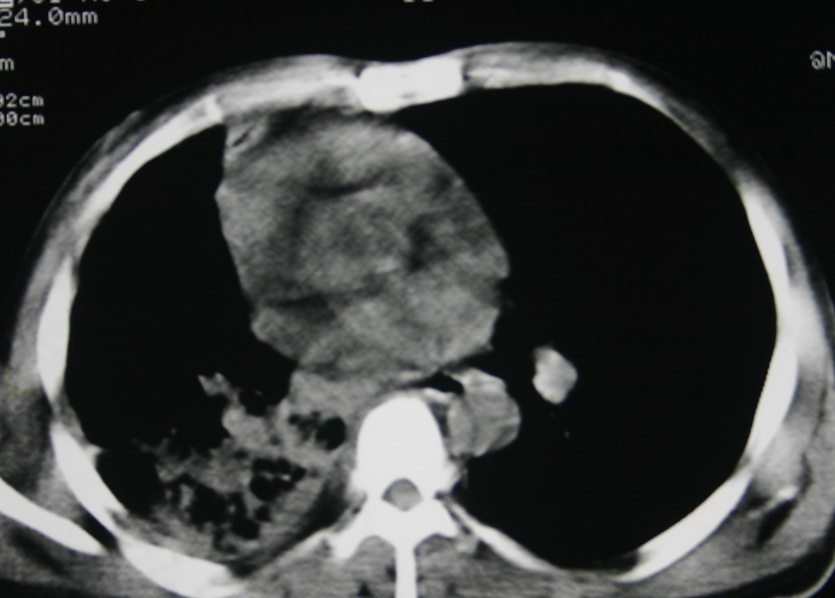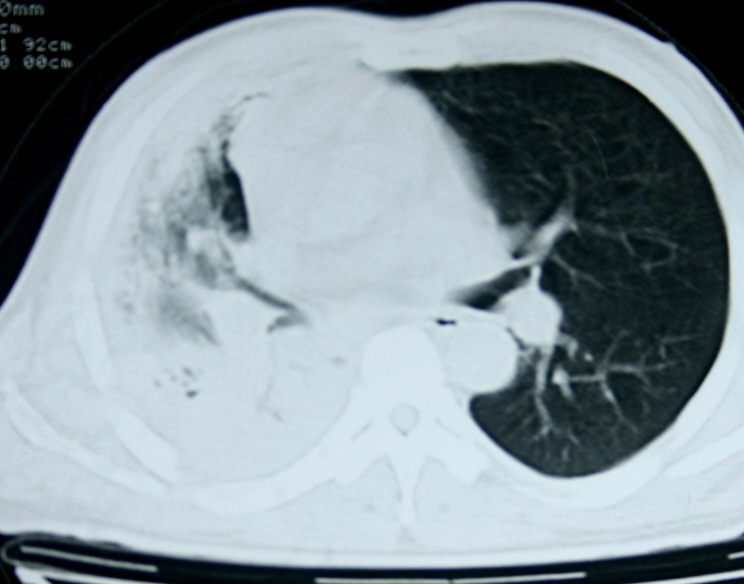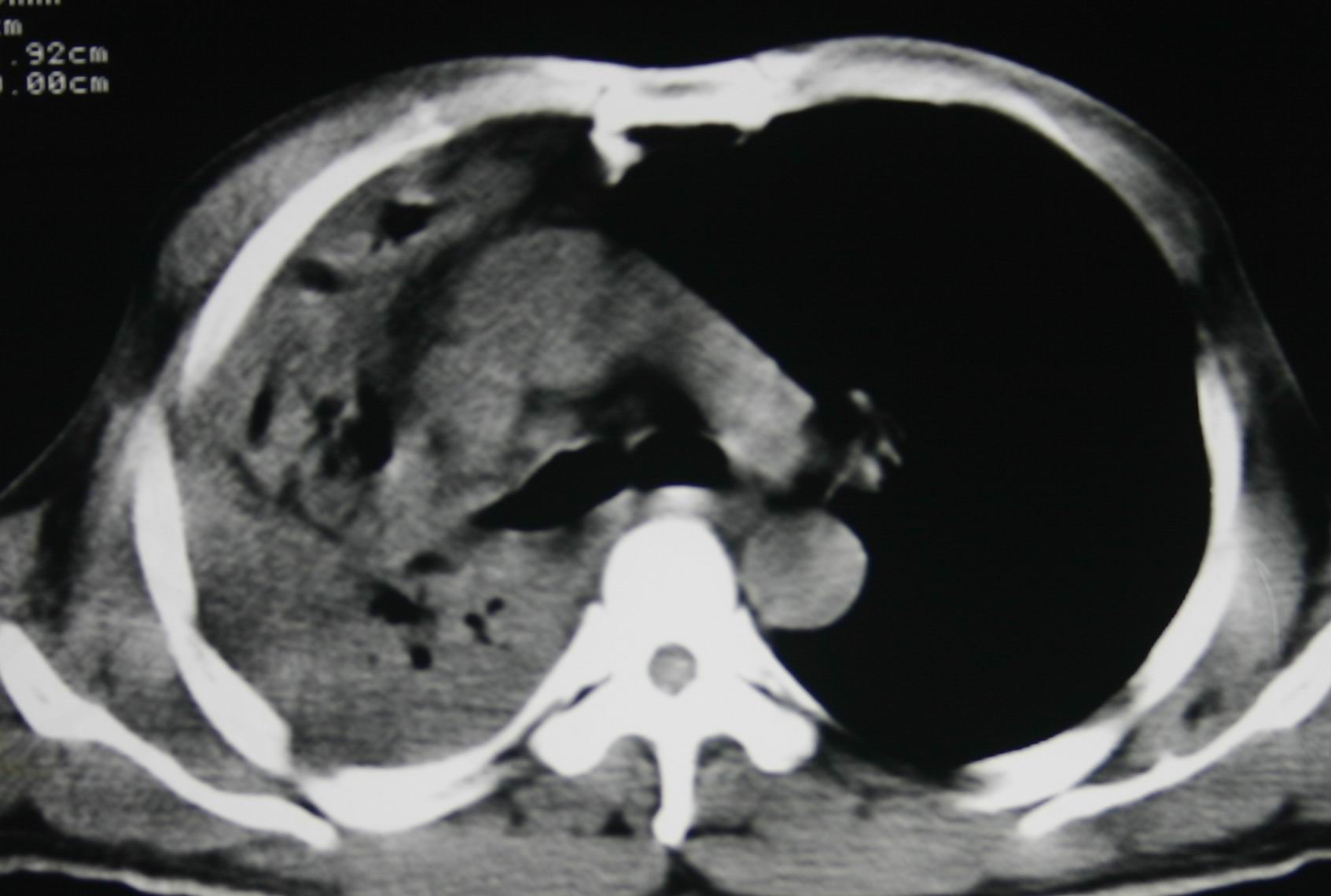 支持:右肺膨胀不全,纵隔右侧移位。肺内有感染,胸腔有积液。建议老片对比。