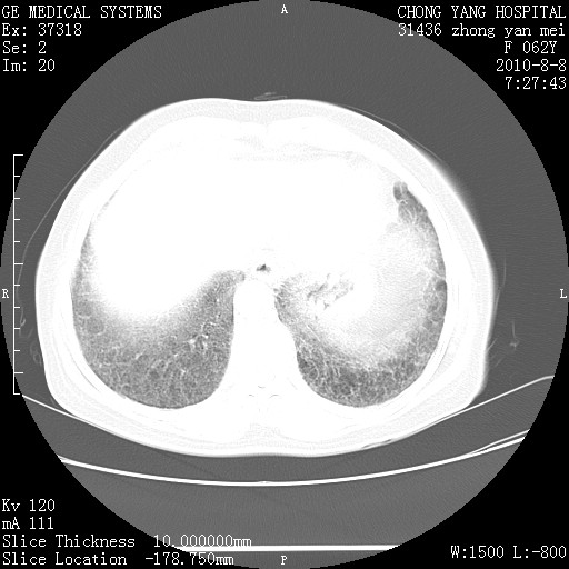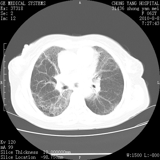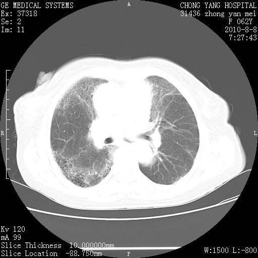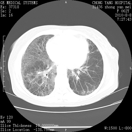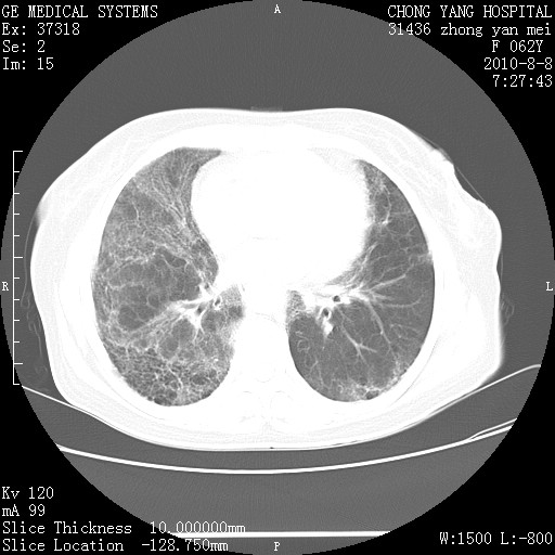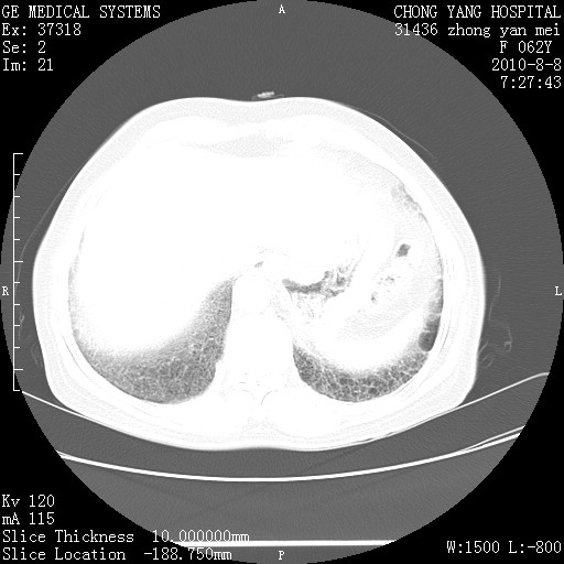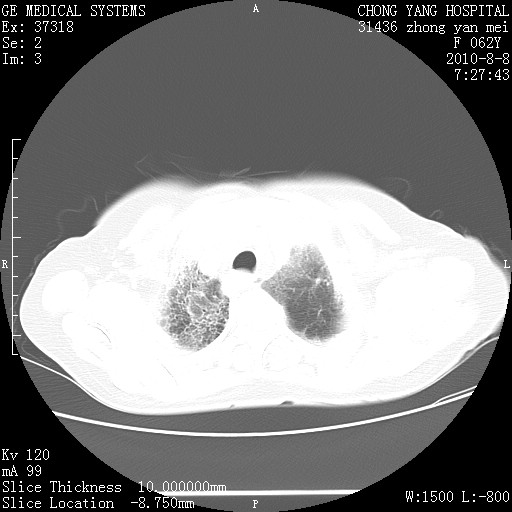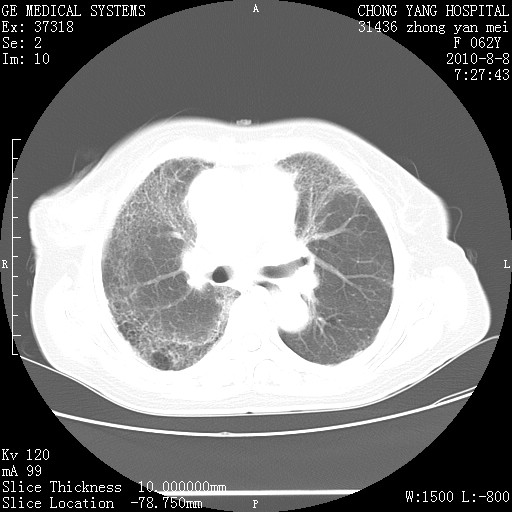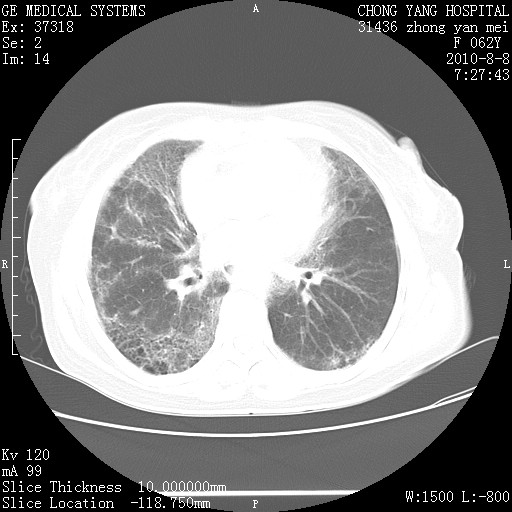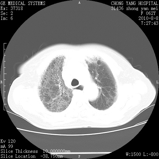 考虑两肺间质性肺炎并肺间质纤维化,肺气囊形成。