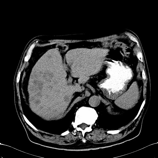 肝脏多方低密度结节,边缘模糊,考虑多发转移,胰管明显扩张,建议增强扫描钩突情况