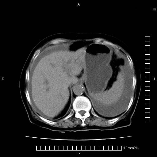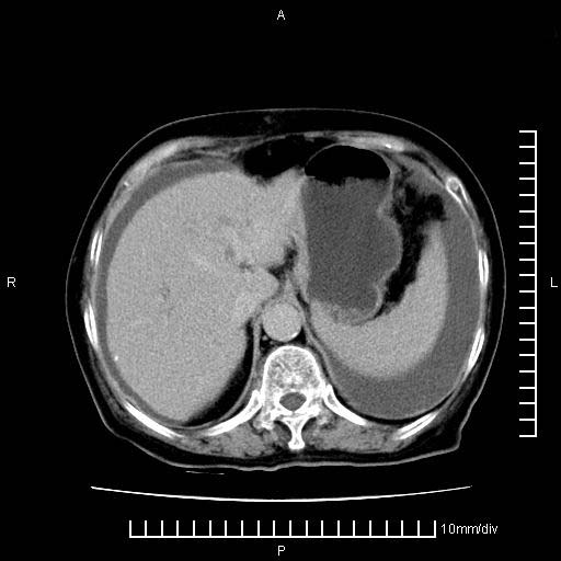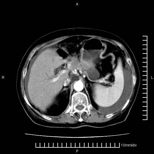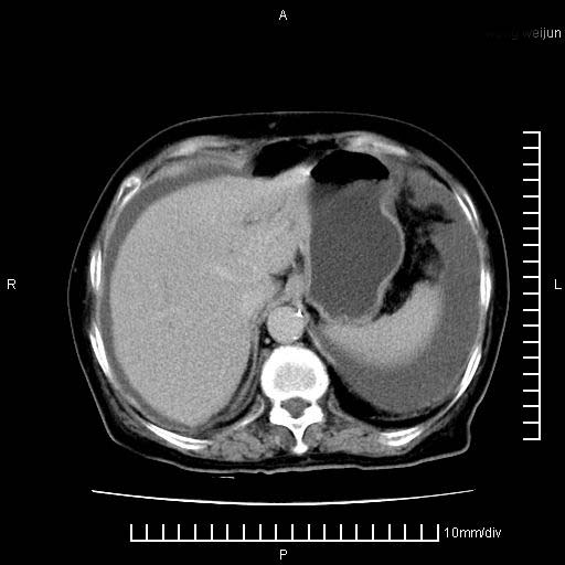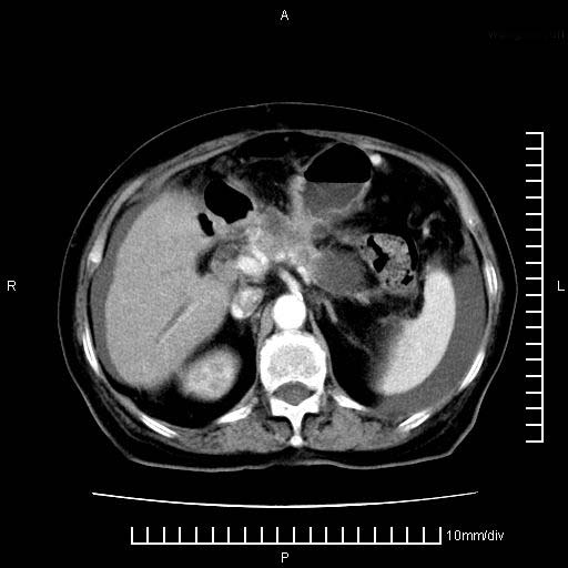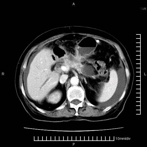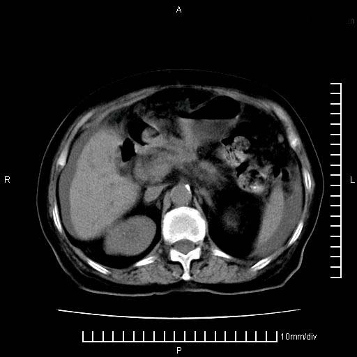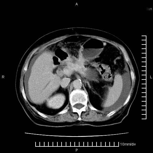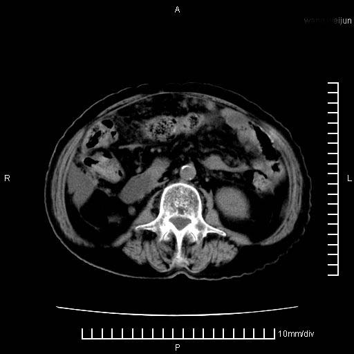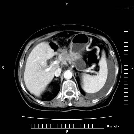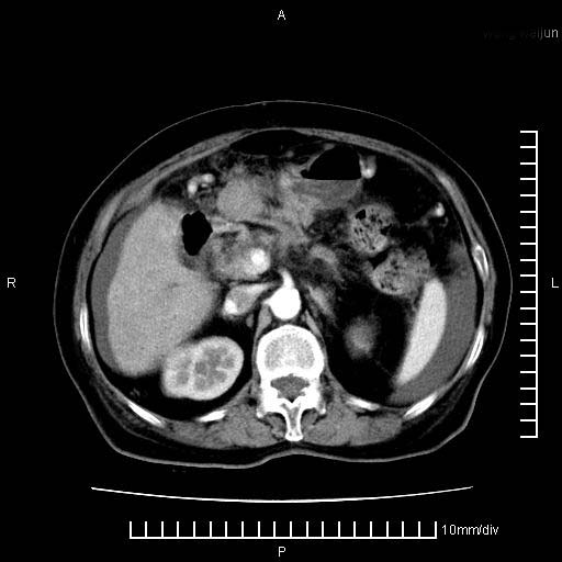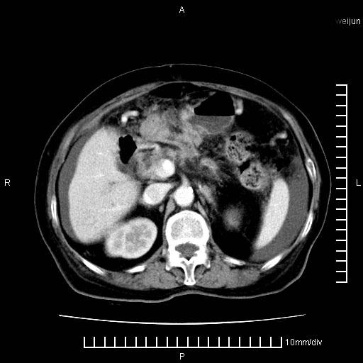 胰腺结构模糊,胰尾部见囊性包块,周围脂肪密度增高,左肾前筋膜增厚,胸水、腹水。不符合胰腺ca伴腹膜腔转移。考虑胰腺炎伴假性囊肿形成、胸腹腔积液。