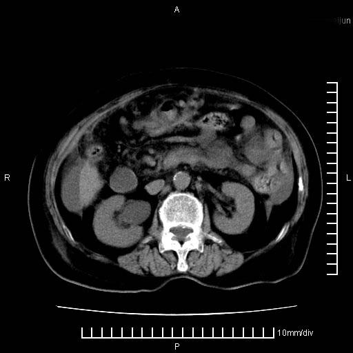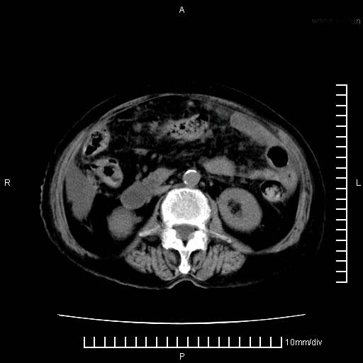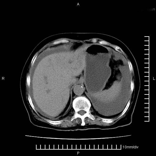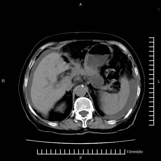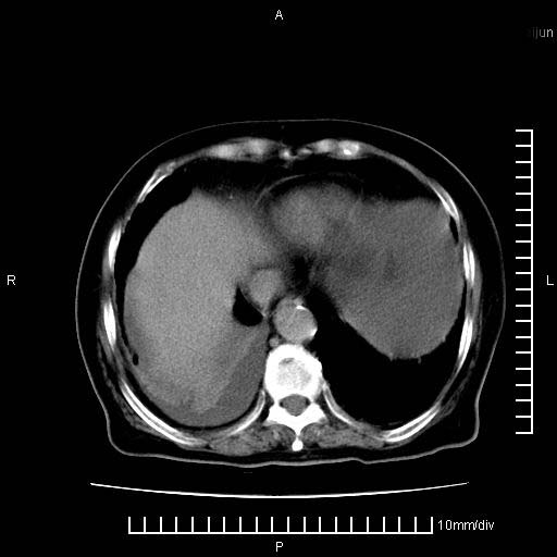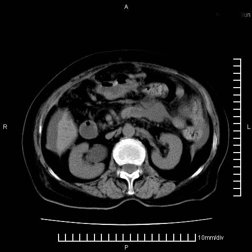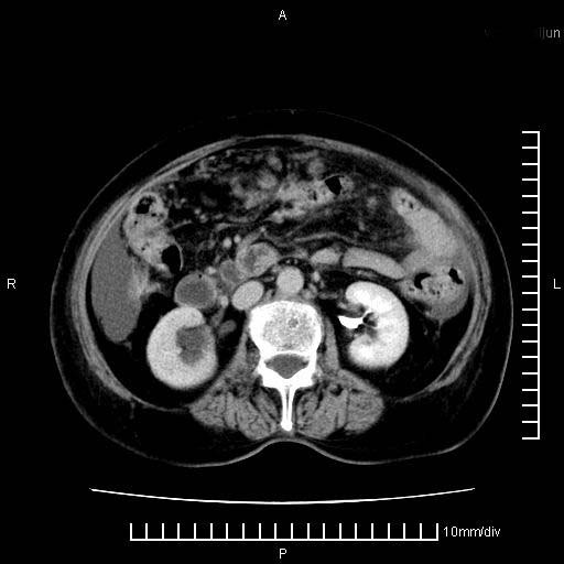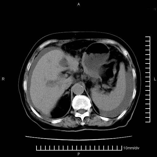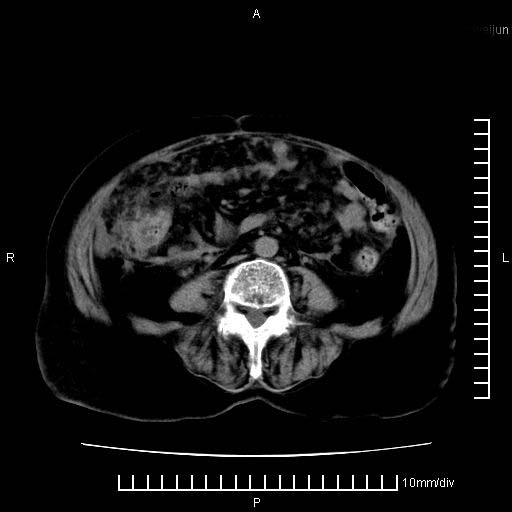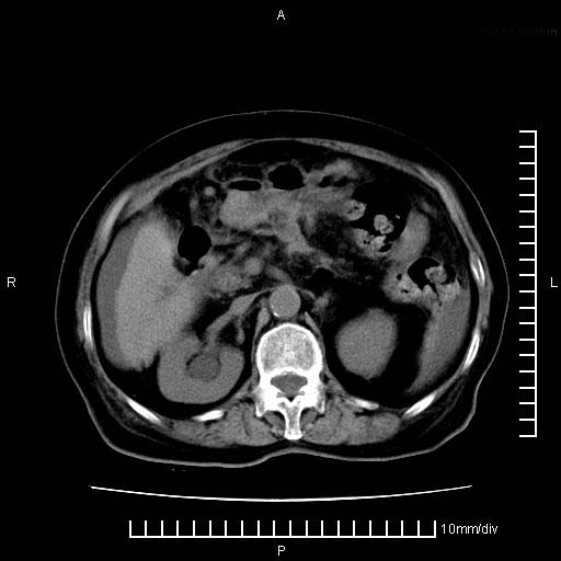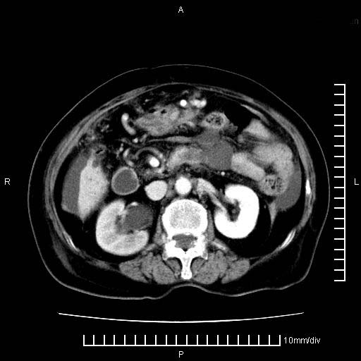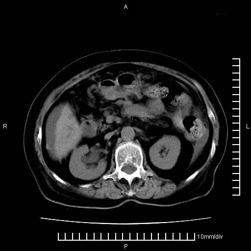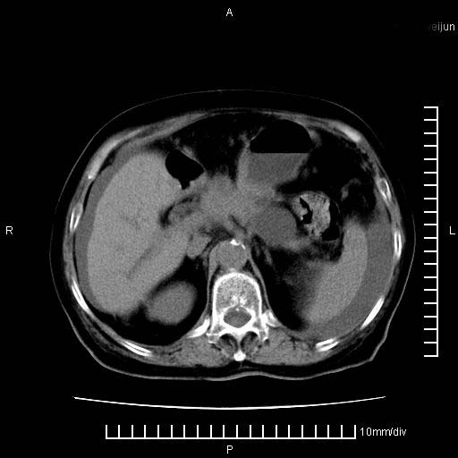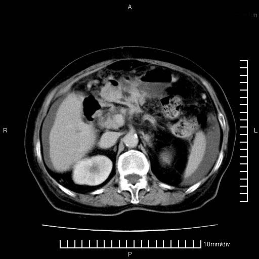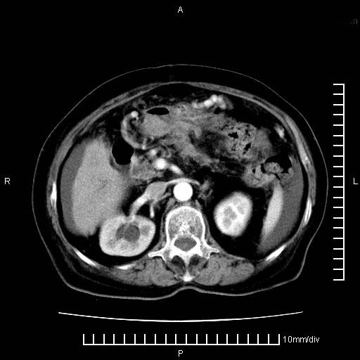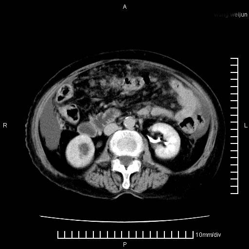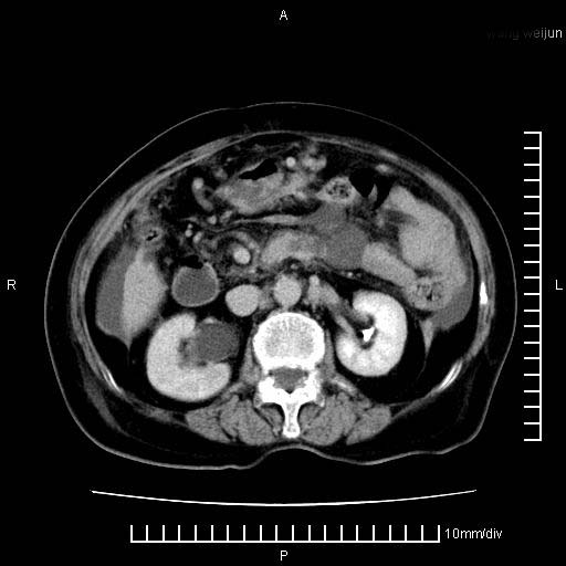 1)考虑胰腺癌并胰腺假性囊肿形成。2)肝内低密度灶,不排除转移。3)右肾盂积水。4)腹水。5)右侧胸腔积液并右肺下叶部分膨胀不全。
