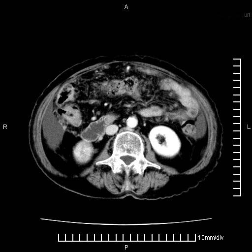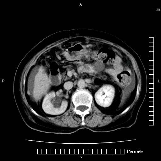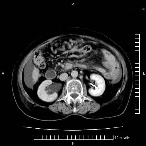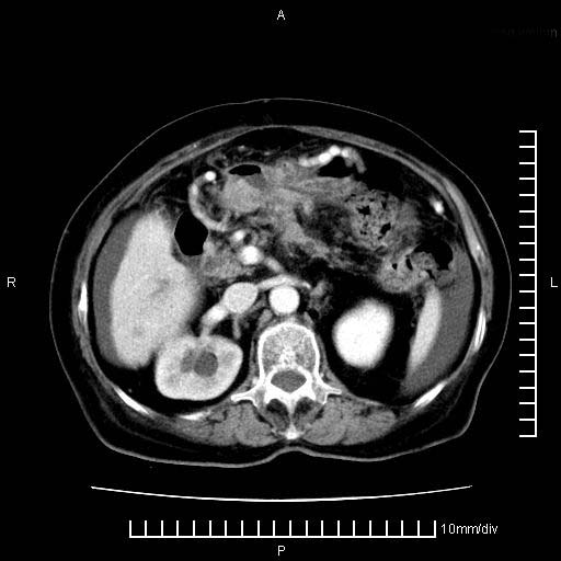 考虑胰腺ca伴腹膜腔转移、肝左叶转移、右肾积水。右胸腔积液。