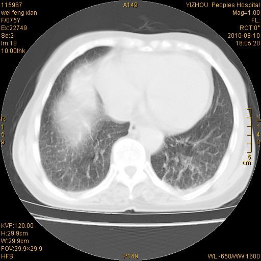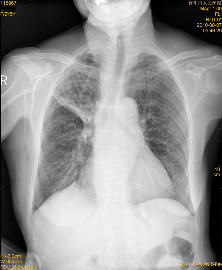 [br]考虑慢支伴右上肺慢性感染可能性大,建议结合临床排外尘肺可能。