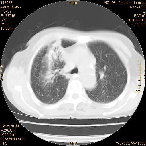 右肺上叶继发性肺结核伴肺内血型播散!