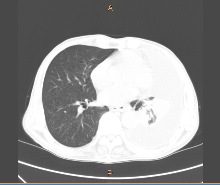 [br]左肺大量胸腔积液伴左肺膨胀不全。双肾囊肿。胃窦怀疑占位,建议胃镜