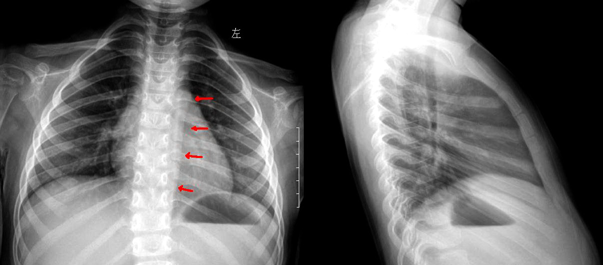 以下是引用shihai在2010-8-28 19:34:00的发言:[br]箭头所示为正常的降主动脉的左侧缘。椎旁线在其内侧,更靠近脊柱,未见增宽。