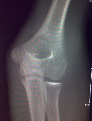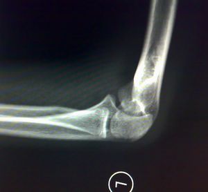 影像所见:左肱骨远端隐约可见自外上髁向髁间走行不规则骨质透亮线,侧位显示肱骨前线欠光整。未见脱位征象。骨骺发育未见异常。