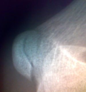 加照对侧,感觉肱骨外上髁上方内侧骨骺旁显示低密度负影。