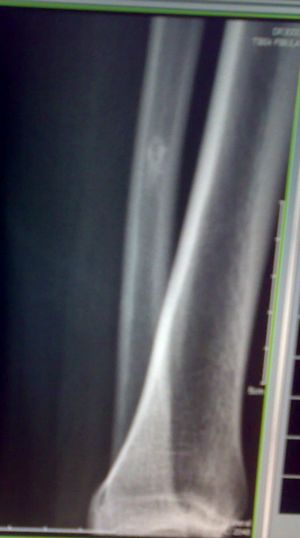 腓骨中下段骨皮质下不规则高密度影,侧位呈水滴形。外伤,估计平时没有症状,结合病人年龄,支持纤维性骨皮质缺损