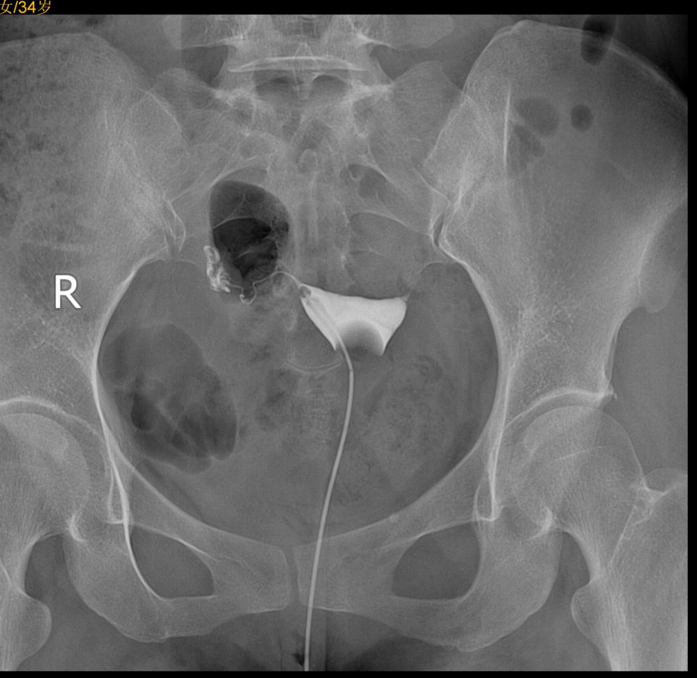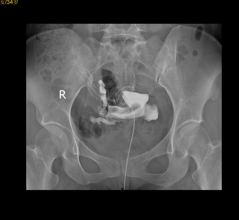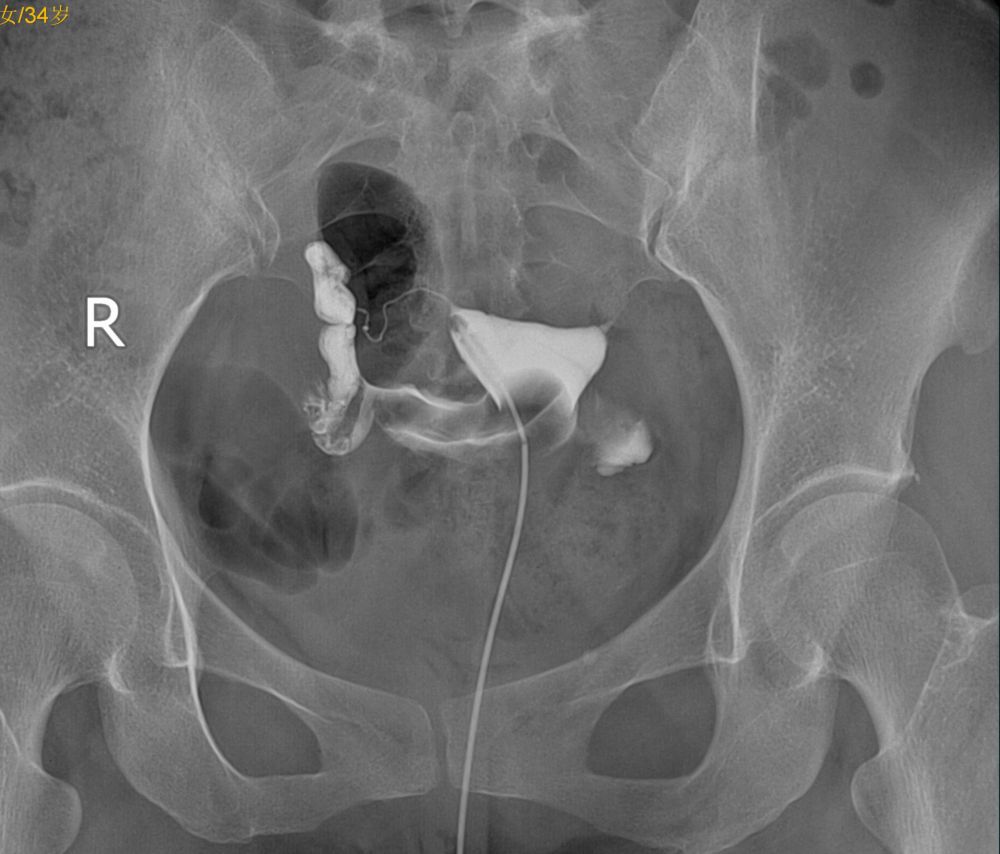 左侧输卵管角部梗阻,右侧宫旁静脉回流