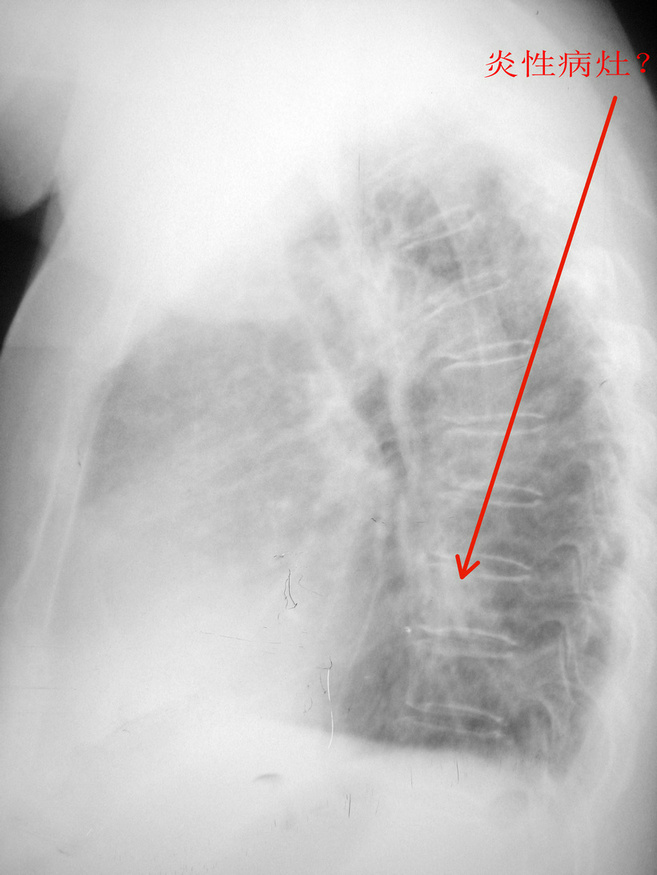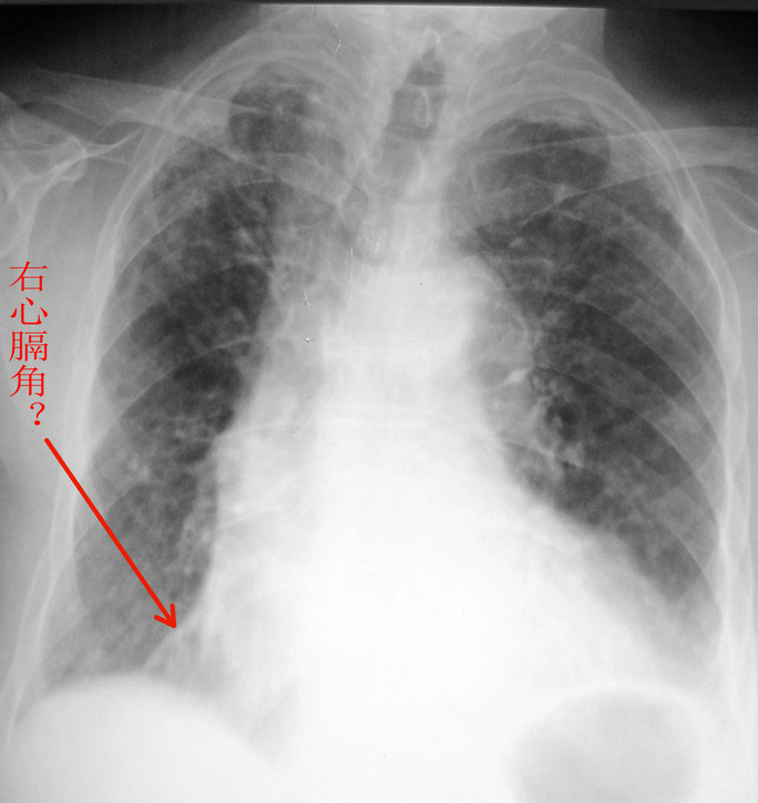 慢支并感染,双上肺不能排除结核,右心膈角最先应考虑心包脂肪垫。体位不正,气管右偏,是不是病人有些驼背所致?