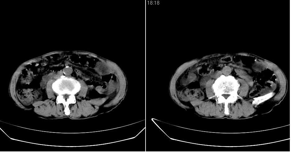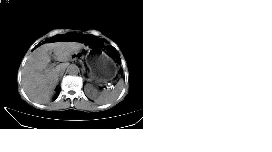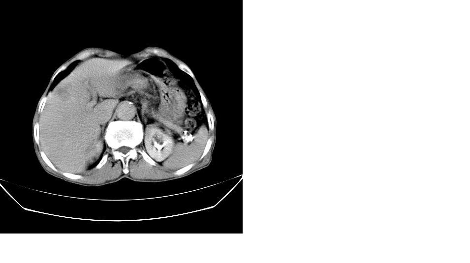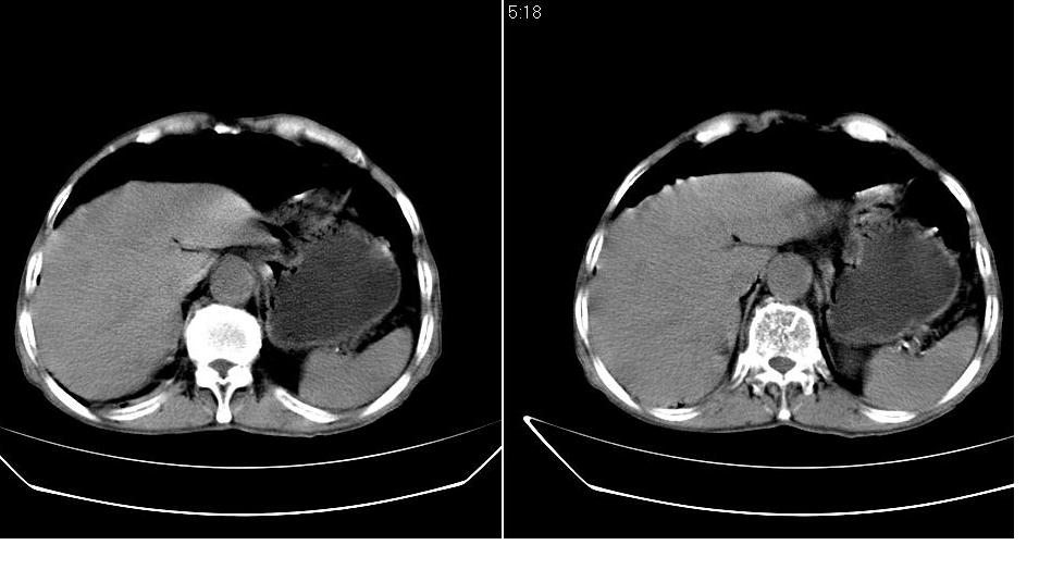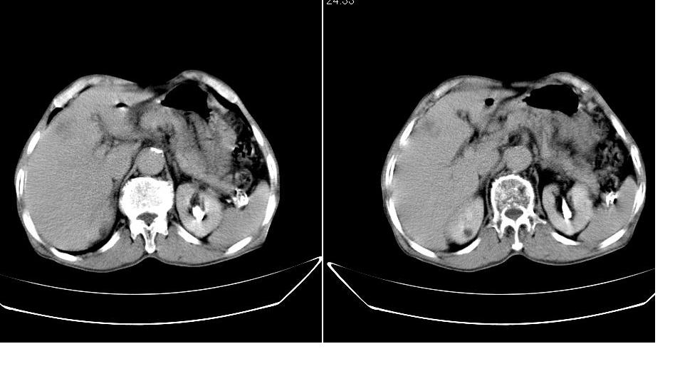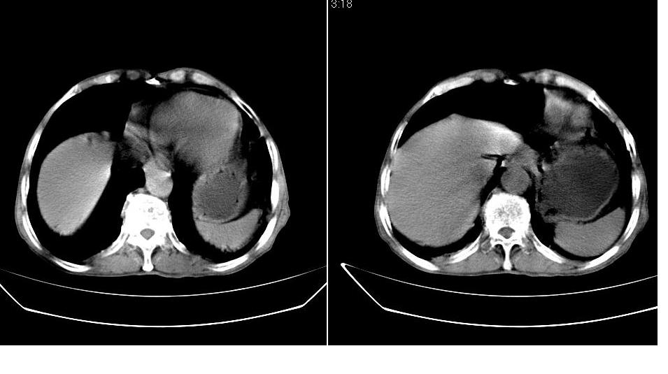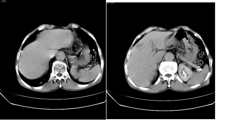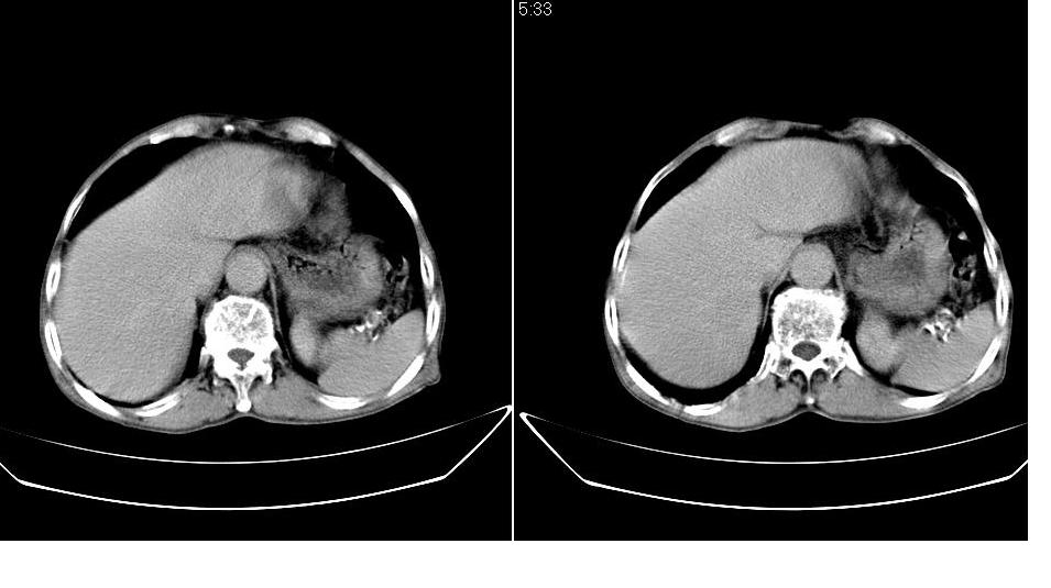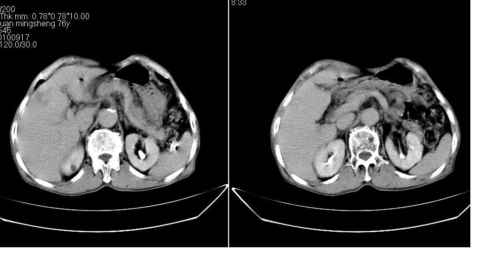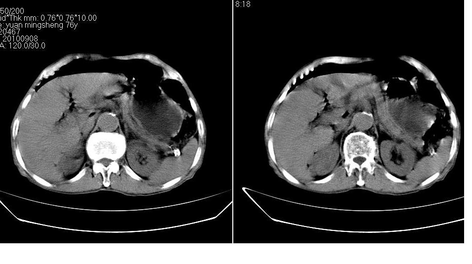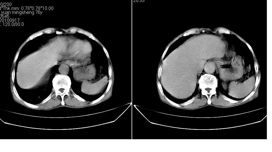 男,76岁,上腹部疼二天来就诊,彩超提示肝左叶占位,随后做上腹部ct平扫,今天做上腹部ct增强扫描,手工推药,效果不好,请谅解。