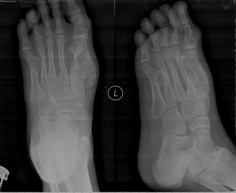 1、左足多发骨旁骨瘤;2、左侧第一、二謶骨骨折。