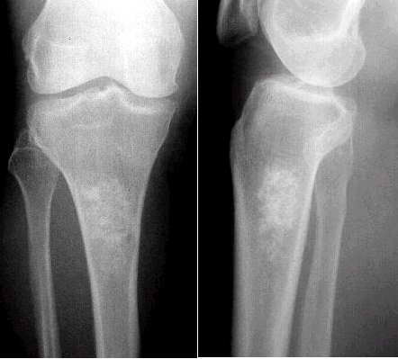 x线表现:右膝关节正位及侧位片显示右胫骨上段骨髓腔内片状高密度影,边缘清楚。