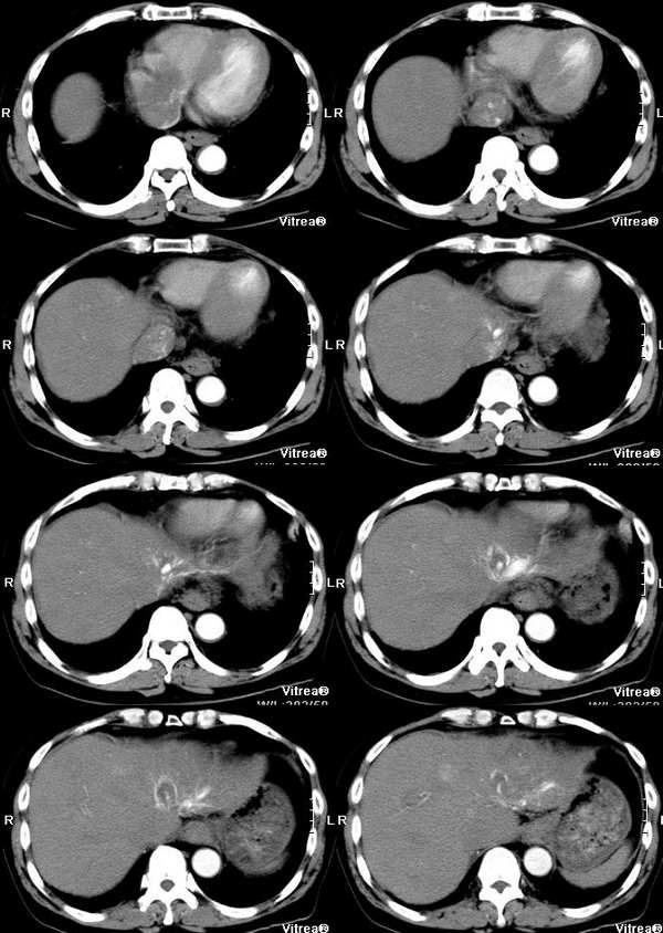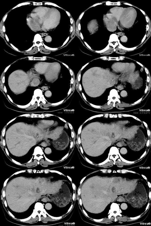 动静脉期见门静脉,下腔静脉增宽,无强化,肝左叶轻度不均匀强化,门脉期门静脉及腔静脉强化不明显,平衡期见病灶密度减低.诊断:肝左叶癌并门静脉,下腔静脉,癌栓形成.