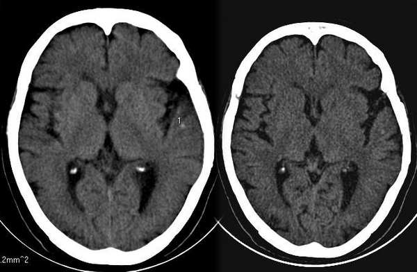 以下是引用xiaoniu在2005-10-29 11:06:00的发言:[br]1、左颞叶皮层点状钙化灶,患者年龄较大,多考虑生理性钙化。[br]2、脑沟裂增宽加深,脑萎缩。