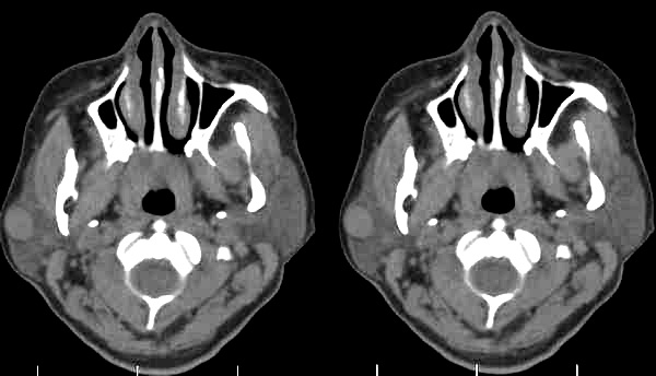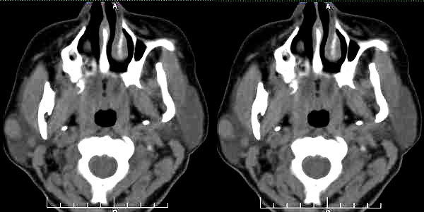 右侧腮腺浅叶圆形稍高密度影,边缘光整,考虑腮腺囊腺淋巴瘤。