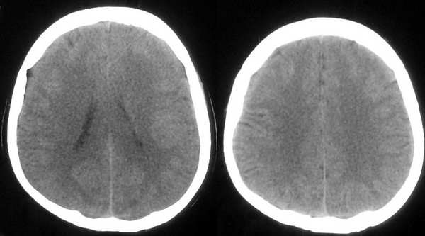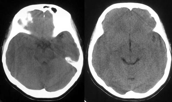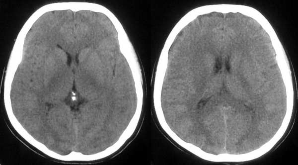 这个病例为正常的头部ct表现,只是由于摆位不正而造成了诸多疑问,所以在工作中要注意摆位问题。