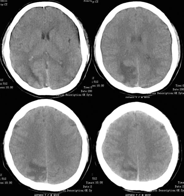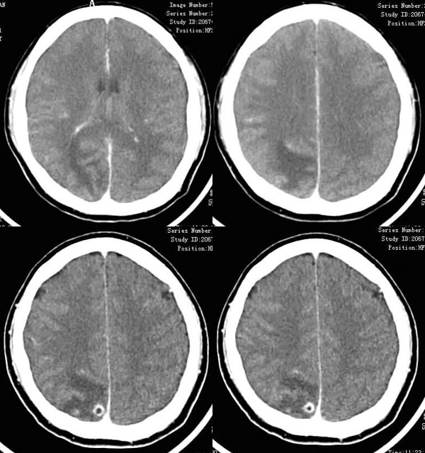 ct平扫:右顶叶可见大片指状水肿,边缘不清,其内后部似有一小环形略高密度影。