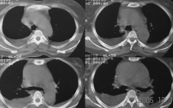 患者急性起病,影象学表现为大量心包积液和双侧胸腔积液,心包积液密度较高,应该考虑为积血,患者没有外伤史,自发性心包积血应该想到主动脉夹层动脉瘤心包内部分破裂的可能,主动脉根部明显增粗也支持该诊断。关于胸腔积液有两种可能的解释,一是由于夹层的压力很高,造成血性胸腔渗出;另外就是由于心包填塞造成腔静脉系统压力增高,引起胸腔的渗出改变。