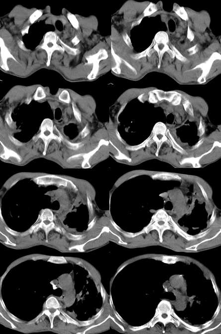 两侧胸廓不对称,左侧明显变小,两肺上叶可见空洞,纤维条索影,两肺下叶多发斑片状影。考虑两肺上叶继发性肺结核伴两肺下叶支气管播散。