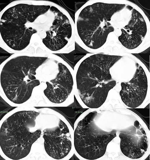 两侧胸廓不对称,左侧明显变小,两肺上叶可见空洞,纤维条索影,两中下肺多发散在小结节、斑片状以及小囊状阴影。考虑两肺上叶继发性肺结核伴两肺下叶支气管播散及感染。