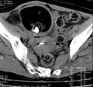 畸胎瘤起源于外,内,中三个胚层,为实质性,常有大小不等的囊性区域,囊性者多为良性,囊壁为纤维组织,易钙化,囊内含有皮脂样液体。组织结构可包含脂肪、毛发、骨与软骨、牙齿等。肿瘤较小时患者多无自觉症状,较大者对组织与器官产生压迫症状。有文献分析40%平片可发现囊壁钙化、肿块中含牙齿和骨结构而明确诊断,但由于ct检查的密度分辨率更高,更易发现脂质、钙化、骨及牙齿等结构,而成为诊断畸胎瘤最特异的方法。如ct上既没有见到脂肪密度,也没有见到钙化的囊性肿块就不能诊断为畸胎瘤。ct检查中必须测定囊性肿块中不同密度组织的ct值,以辨别是否含有脂肪组织,如有脂肪一液体平面时,可改变体位扫描,低密度的脂肪成分必然始终飘浮在上方。盆腔非脏器起源的畸胎瘤常发生在骶骨前区、恶性畸胎瘤占有一定比例,这时脂肪钙化或骨化成分较少,常破坏骶骨并侵犯邻近脏器者,与其它恶变较难鉴别。