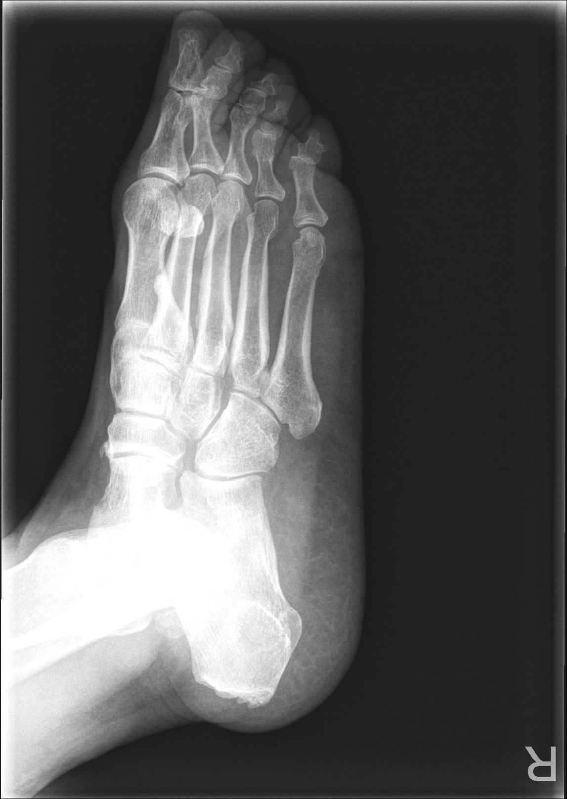 右第二跖骨内侧局限性突起,考虑变异可能。