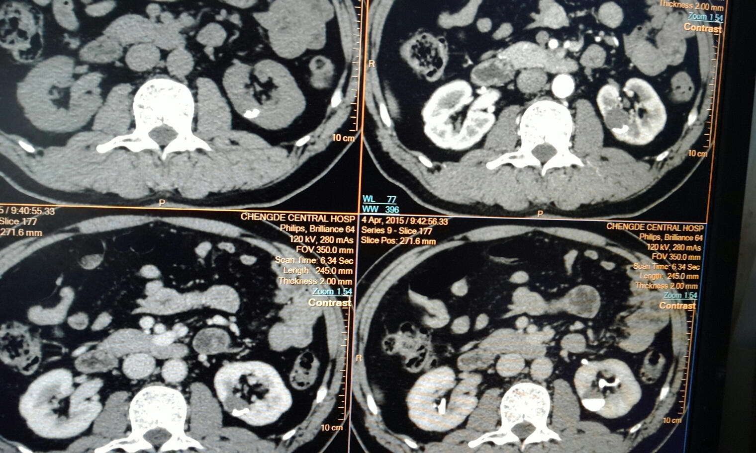 平扫肾内囊性病灶,底部可见高密度影;延迟似有造影剂进入。