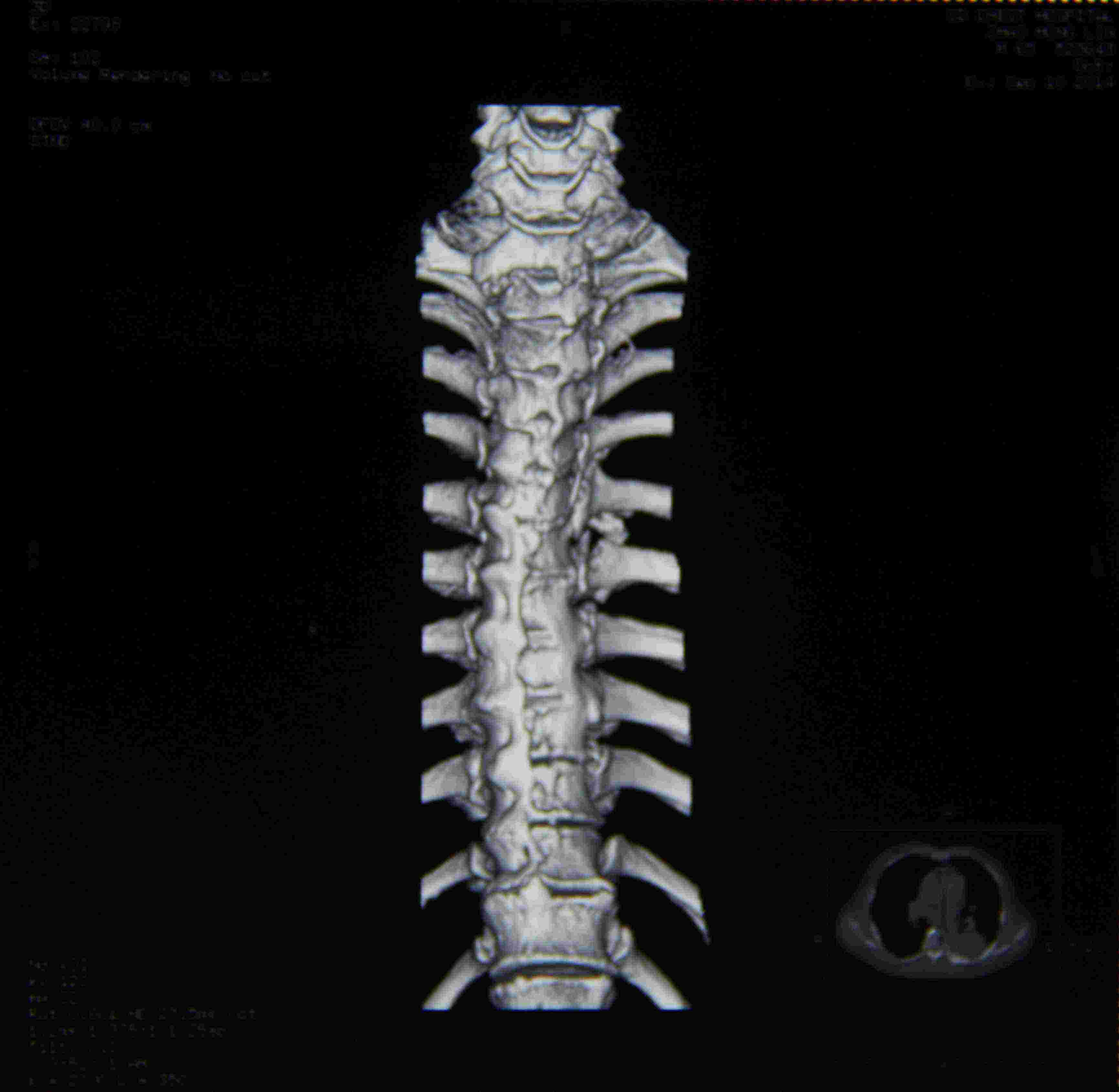 者,男,65,9年前食管癌术后治疗后,期间曾出现身体多处疼痛,风湿因子阳性,诊断为风湿性多肌疼,激素治疗明显好转,病人自行停药,余身体无明显不适,2012年查体发现胸椎7、8、9,胸11、12异常信号,无明显不适, ...