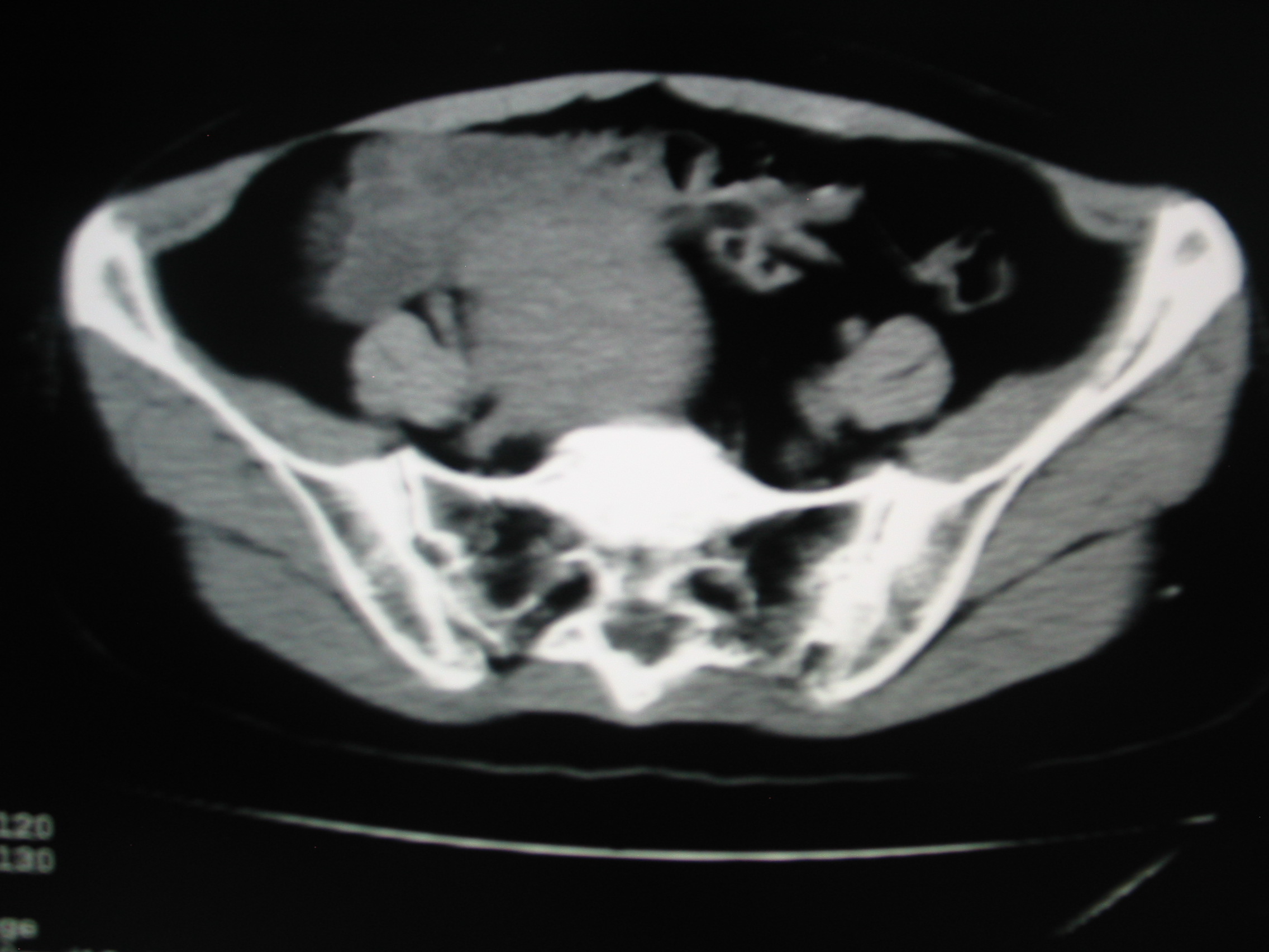 子宫及周围可见巨大软组织密度包绕,右侧附件区见低密度影,考虑巨大子宫肌瘤,右侧卵巢囊肿可能。
