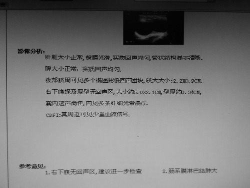右下腹近腹壁肠管间可见多个类圆形低密度影,边缘清楚,部分肠管壁稍厚且见少许低密度及气体密度影,考虑肠系膜囊肿并感染可能。