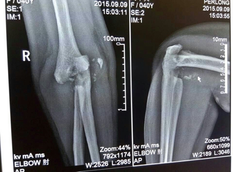 右肘关节神经病性关节病(charcot关节病——即夏科氏关节病)。